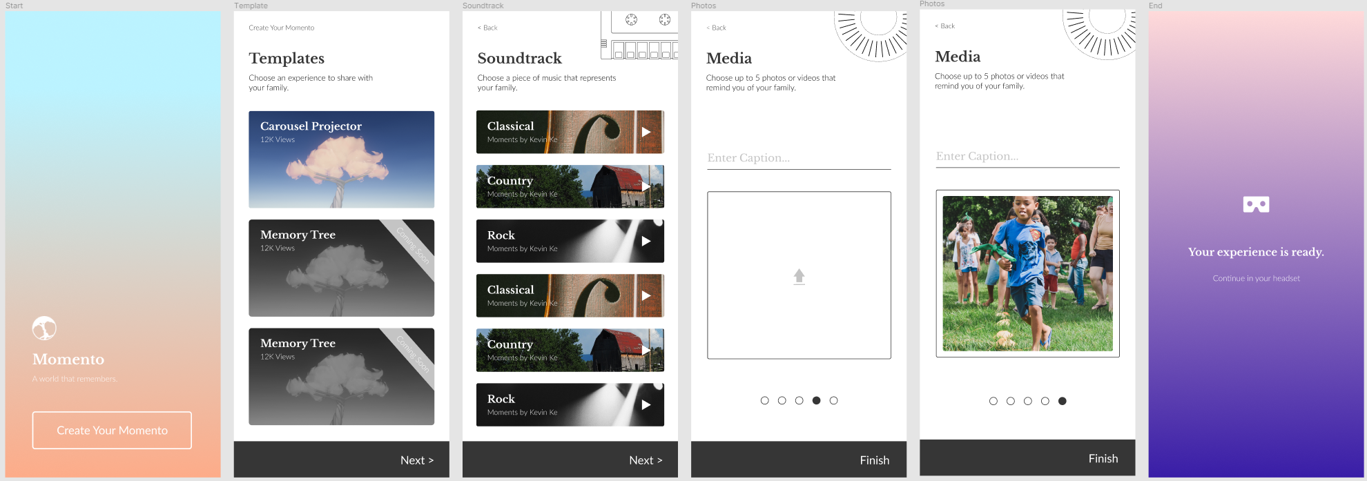 Momento is a platform for creating VR memory palaces. It provides curated templates of spaces in VR where users can replace with their own photos and videos, allowing users to generate a personal VR experience as easy as creating a slideshow.
