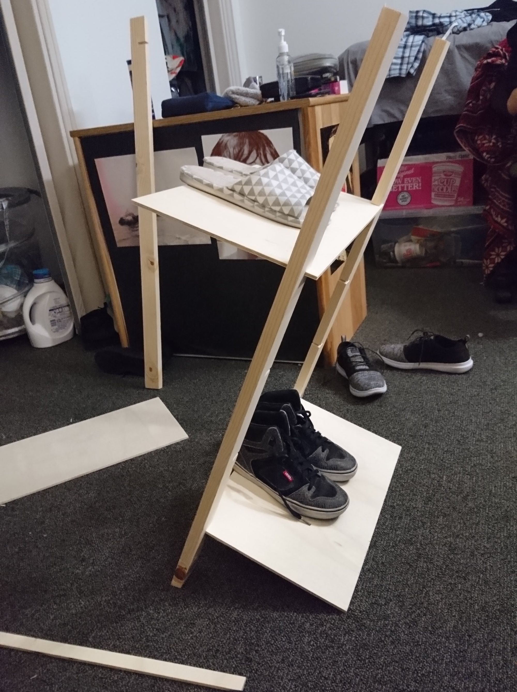 In an effort to organize my shoes instead of leaving them in a pile, I decided to build a shoe rack for my room. It needs to be easily disassembled and use minimal materials. Because I study far from home, I move between my dorm and a summer home every year. Any extra furniture I own needs to be compact and lightweight. With these ideas, I began to sketch up some designs.