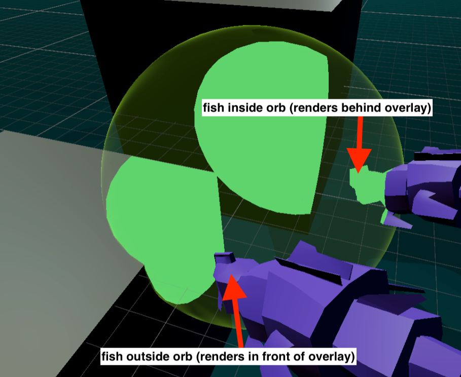 This lets the green overlay render behind objects outside the orb, while still rendering in front of objects inside the orb: