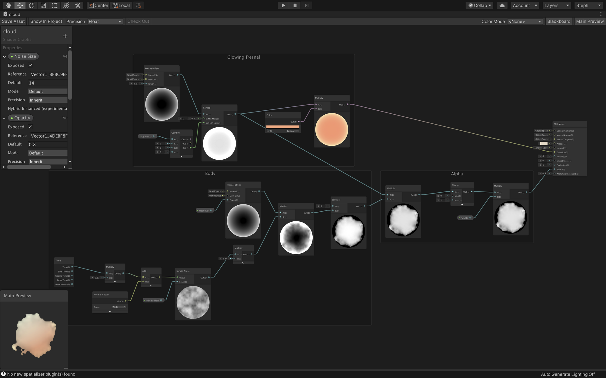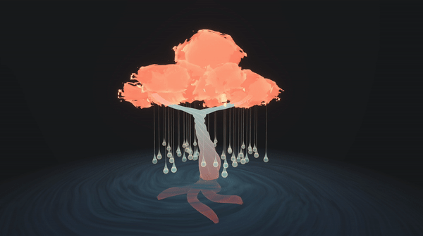 The cloud shader combines a moving noise texture with a fresnel node to create a shimmering effect. The trunk and orbs use a gradient + fresnel shader, and the water uses a twirling noise texture.