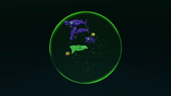 The translucent bubble doesn't show depth well – you can't tell which fish is within it. I added some floating "+" particles but it didn't help much.